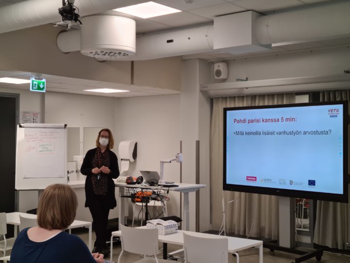 Alkulämmittelyksi pidimme Kahoot-tietovisan, jossa kysyimme mm. ikäihmisten lukumäärää Suomessa, persoonan muuttumista ikääntyessä, ja missä ikäihmisiä hoidetaan. Sen jälkeen vanhustyön asiantuntija Arja Virolainen kertoi Vetovoimainen vanhustyö -hankkeen tavoitteista, ja mitä olemme jo saaneet tähän mennessä aikaan hankkeessa mukana olevissa hoitoyksiköissä.