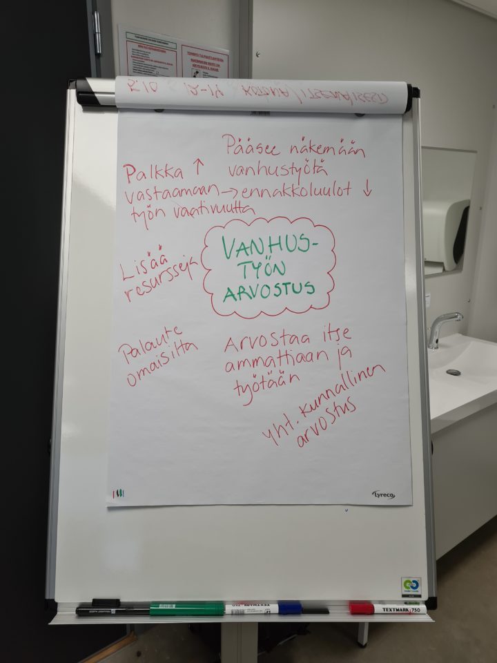 Keskustelua syntyi niin paljon, ettei tila riittänyt kaikkien asioiden kirjaamiseen. Kuitenkin yhteistä monella oli se, ettei heillä ollut ennen opiskelun alkua minkäänlaista tietoa vanhustyön moninaisuudesta ja sen tarjoamista mahdollisuuksista, koska sitä ei ollut tuotu selkeästi esille, eikä siitä etsimälläkään löytynyt paljon tietoa. Näiden sekä muiden opiskelijoiden toiveena onkin, että vanhustyötä tekevät jakaisivat sisältöä omasta työarjestaan yksikkönsä omiin viestintäkanaviin, jo rekrytointivaiheessa tuotaisiin esille työn oikeanlainen luonne sekä työtehtävät, ja jokainen alalla oleva arvostaisi sekä omaa että muiden tekemää arvokasta työtä vanhusten parissa.