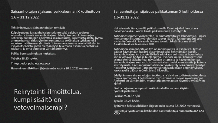 Sitaattien mukainen tehtävänkuvaus herättää nopeasti kysymyksen, että mitä sairaanhoitajan tehtävät pitävät sisällään. Kattavammin kuvattu tehtävä antaisi paremman käsityksen siitä, millainen työ on kysymyksessä. Heikki Huilajan väitöskirjan mukaan rekrytointivaiheessa pohditaan ja puntaroidaan henkilön työhön sopivuutta. Prosessi ei ole yksisuuntainen, vaan pohdintaa tekee sekä työnhakija että työnantaja. Rekrytointi-ilmoituksen laatijan tulisikin antaa työnhakijalle hyvät eväät pohtia omaa sopivuuttaan haettavaan työpaikkaan. Huolellinen ja totuuden mukainen tehtävänkuvaus on keskeinen osa rekrytointi-ilmoitusta. Kuvausta laadittaessa voisi käyttää apuna kysymystä ”mitä juuri tässä ilmoitukseen laittamassani työssä konkreettisesti tehdään?”