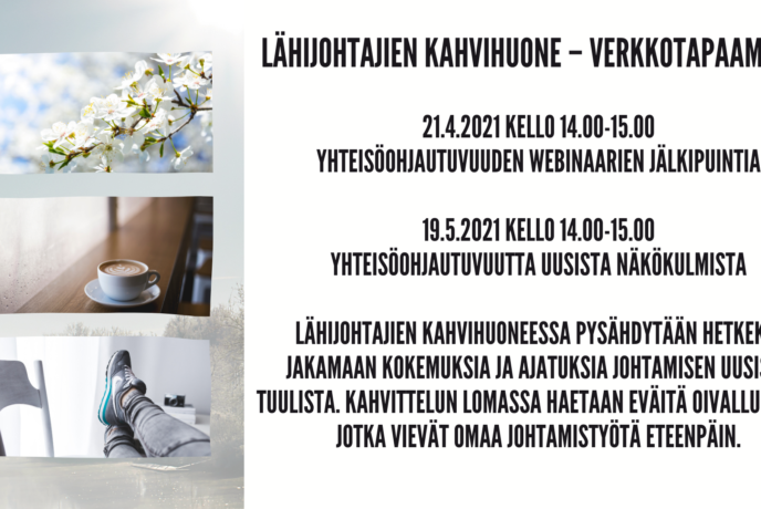 28.4.2021 Lähijohtajien kahvihuone –sarjan ensimmäinen tapaaminen oli 21.4.2021. Kutsuimme lähijohtajia pysähtymään hetkeksi jakamaan kokemuksia ja ajatuksia johtamisen uusista tuulista. Yhteisöohjautuvuus oli valittu teemaksi, johon eväitä antoivat Kati Toikan kaksi webinaaria. Puhuimme alkuun itse- ja yhteisöohjautuvuuden eroista. Tunnistimme itseohjautuvuuden olevan meissä jokaisessa oleva ominaisuus, jota tarvitaan työssä nykyään paljon. Yhteisöohjautuvuus on tiimin tai työyhteisön tapa toimia. […]