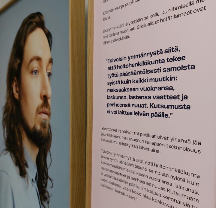 – Tällä hetkellä hoitajat käyvät suurta ja vakavaa taistelua omien oikeuksiensa puolesta. Tämä näyttely on osoitettu solidaarisuutena heidän oikeuksilleen. Toivon, että tarinat pysäyttävät myös teidät, ja saa meistä jokaisen miettimään sitä, kuinka koko hoitoala on se, joka pitää suomalaisen yhteiskunnan pystyssä, Koutaniemi sanoi avajaisiin nauhoittamassaan videotervehdyksessä.