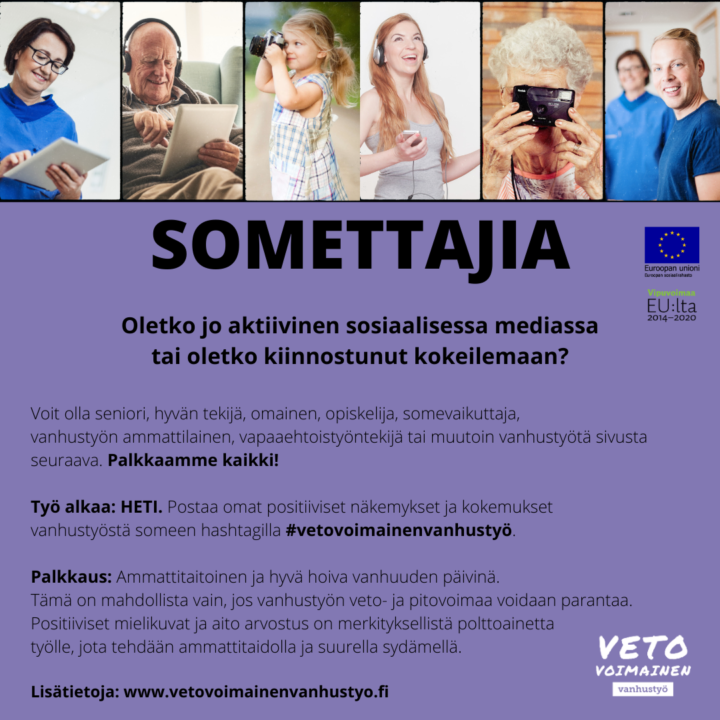 Kaikkien aikojen, tai ainakin kevään 2021 suurin rekrytointi on käynnissä. Vetovoimainen vanhustyö –hanke etsii sisällöntuottajia, tarinan kertojia, totuuden torvia, reporttereita, somevaikuttajia, ihan meitä kaikkia kertomaan vanhustyöstä ja sen hyvistä puolista. Kaikki palkataan! Palkkana on turvallinen vanhuus ammattilaisten hyvässä hoivassa. Haluathan varmistaa sen itsellesikin?